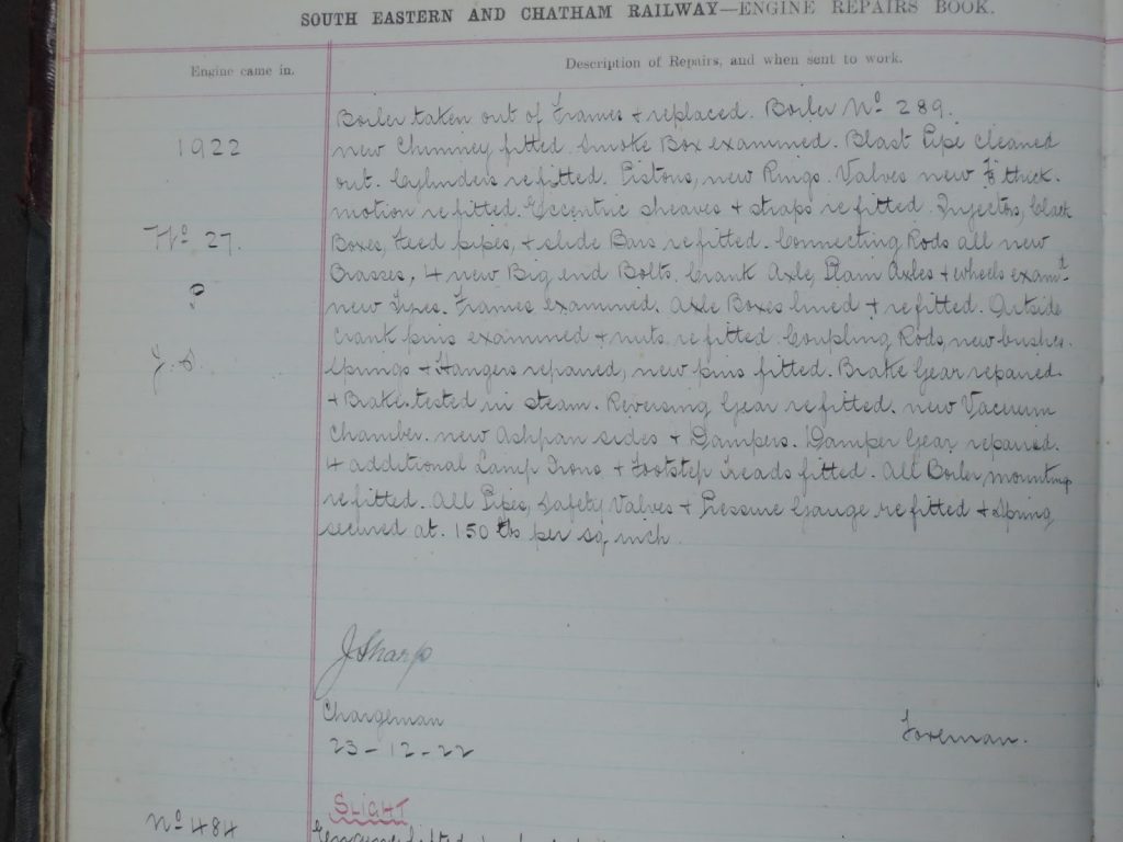 I had an email recently from John Arkell of the SECR Society who has spent some time at the National Archives this year undertaking some research & during which he has found reference to the repairs carried out on No.27 in December of 1922 by the SECR. It gives details of the work carried out, the boiler number 289 and the fact that it was given a new chimney!