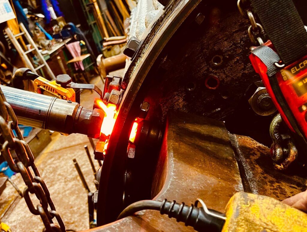 With the repair section to the bottom of the boiler welded in and the tube plate set into its final position the front tube plate is finally ready to be riveted into place using the modified and upgraded hydraulic rivet squeezer especially adapted for this task. Once the front tube plate has been fully riveted into position the boiler tubes can be fitted and expanded into place in preparation for the boilers hydraulic & steam tests.